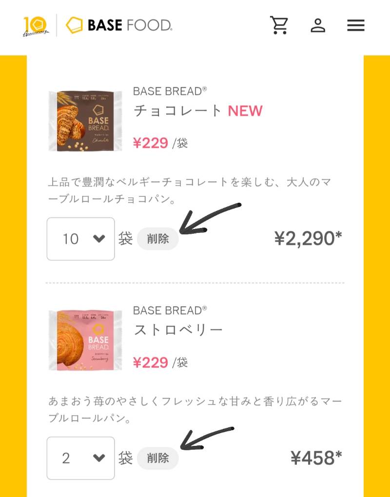 ※ベースブレッドは「商品をすべて削除=定期便の解約」となります